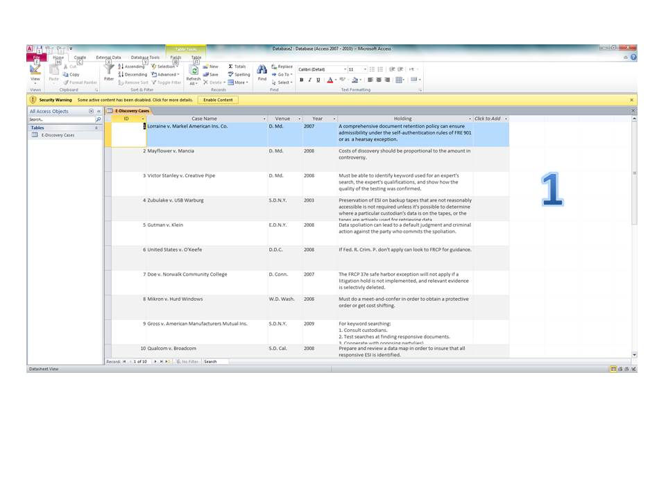The tutorial will show you how to import data from an Access table like the one shown in Figure 1 below. [N.B. this database contains accurate, but incomplete information on e-discovery cases that I cribbed partially from E-Discovery for Dummies. It's just an example, and is not meant to be a data source you should rely upon.]